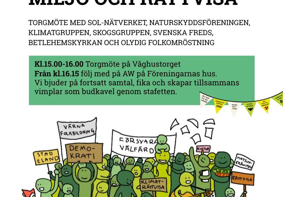 SOL-nätverket och Naturskyddsföreningen bjuder in till torgmöte! Den 10:e april, Kl.15.00-16.00, På Våghustorget Meddela gärna att du kommer i vårt Facebook evenemang HÄR Från kl.16.15 – följ med på AW på Föreningarnas hus.Vi bjuder på fortsatt samtal, fika och skapar tillsammans vimplar som budkavel genom stafetten. Deltar gör: SOL-nätverket, Naturskyddsföreningen, Klimatgruppen, Skogsgruppen, […]